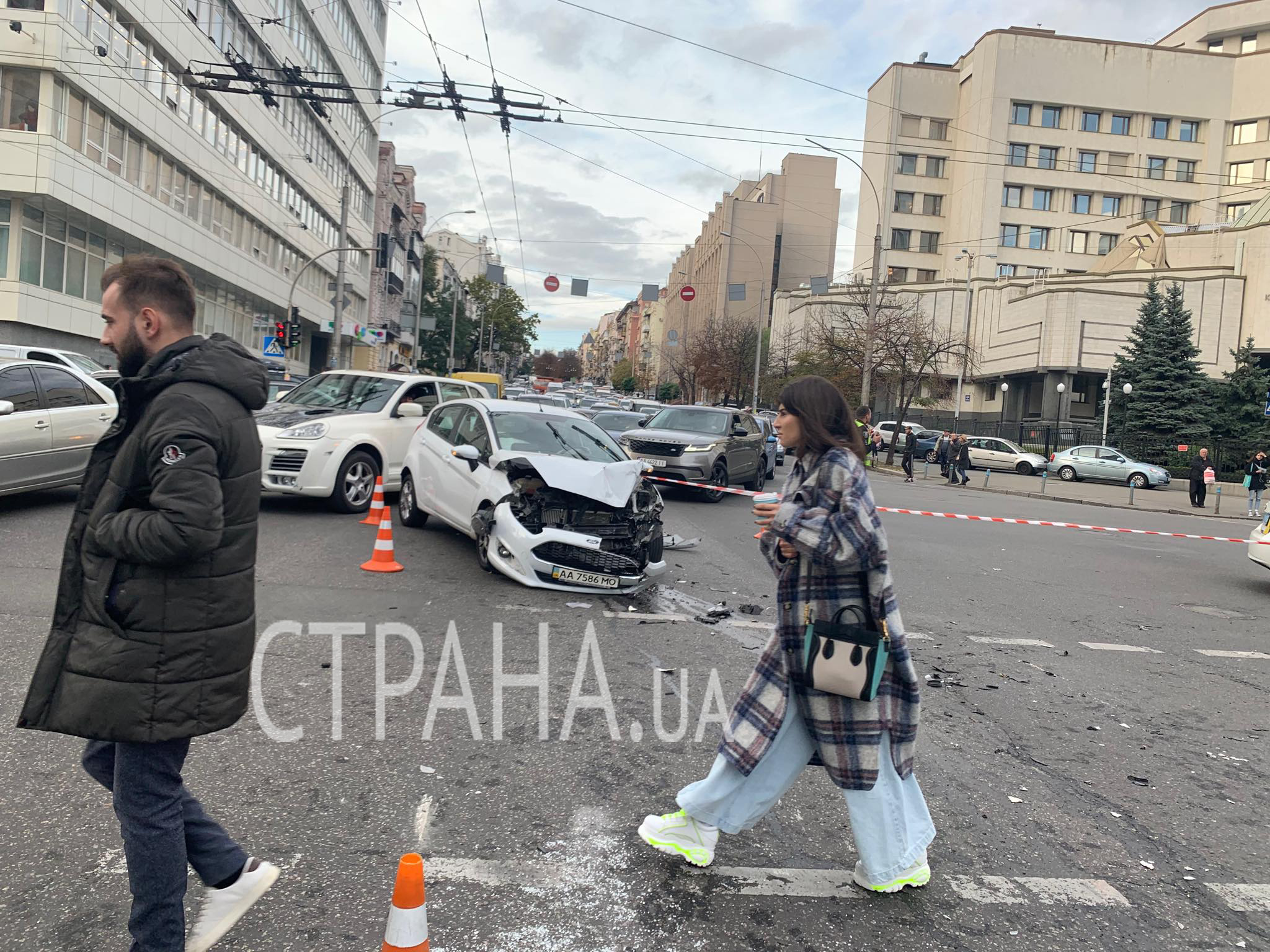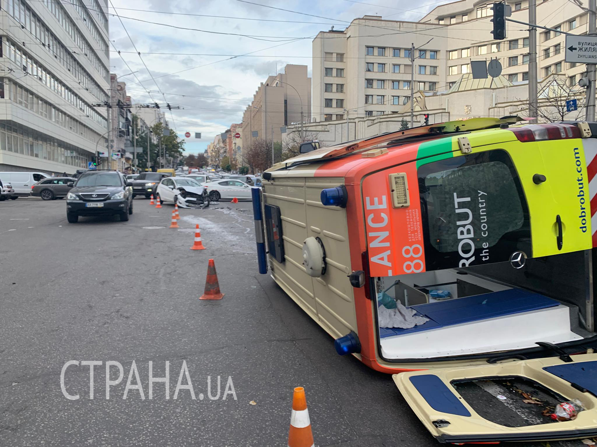 В Киеве на перекрестке улиц Жилянской и Антоновича автомобиль Ford протаранил автомобиль скорой помощи, в результате чего тот перевернулся на бок. О происшествии сообщает патрульная полиция Киева в Facebook