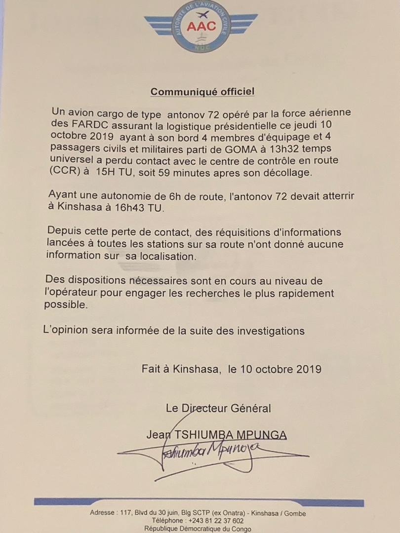 Известно, что самолет вылетел из аэропорта Гомы в четверг, 10 октября, в 13:32 по местному времени (15:32 по Киеву) и направился в Киншасу. Пилоты перестали выходить на связь с центром управления примерно спустя час. В районе предполагаемого исчезновения начата поисково-спасательная операция.