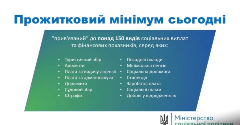 Она рассказала, что сегодня прожиточный минимум перестал быть критерием бедности и используется как фискальный индикатор. Министр рассказала, что к нему "привязаны" более 150 видов выплат и финансовых показателей, среди которых: туристический сбор, алименты, плата за выдачу лицензии, админуслуги, госпошлина, судебный сбор, штрафы, заработная плата, должностные оклады, стипендии, суточные в командировках и т.п., кроме социальных выплат, льгот и пенсии.