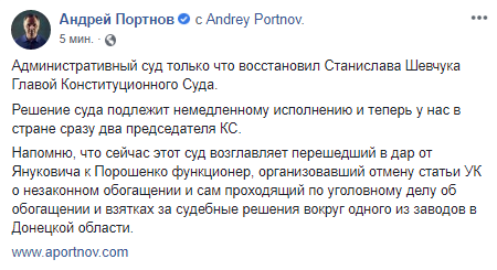 Юрист Андрей Портнов написал в Facebook о том, что в Украине теперь сразу два председателя Конституционного суда.