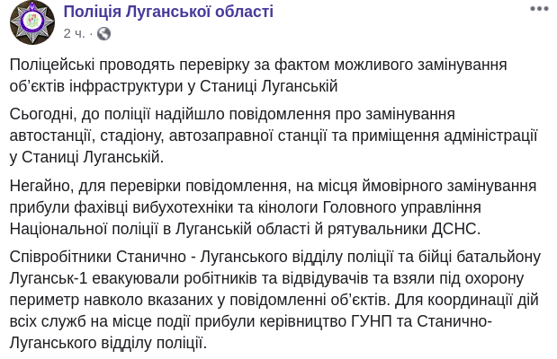 Сотрудники Станично-Луганского отдела полиции и бойцы батальона "Луганск-1" эвакуировали рабочих и посетителей и взяли под охрану периметр вокруг указанных в сообщении объектов. Для координации действий всех служб на место происшествия прибыло руководство ГУНП и Станично-Луганского отдела полиции.