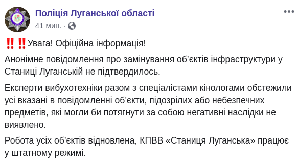 "Анонимное сообщение о минировании объектов инфраструктуры в Станице Луганской не подтвердилось. Эксперты-взрывотехники вместе со специалистами-кинологами обследовали все указанные в сообщении объекты, подозрительные или опасные предметы, которые могли бы повлечь за собой негативные последствия, не обнаружены. Работа всех объектов восстановлена, КПВВ "Станица Луганская" работает в штатном режиме", - говорится в сообщении.