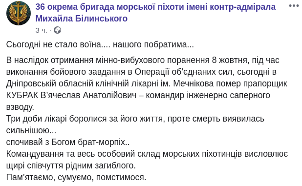 В пятницу, 11 октября в Днепровской областной клинической больнице им. Мечникова умер прапорщик Вячеслав Кубрак - командир инженерно-саперного взвода 36-й отдельной бригады морской пехоты имени контр-адмирала Михаила Билинского. Об этом сообщает Facebook-страница 36 бригады.