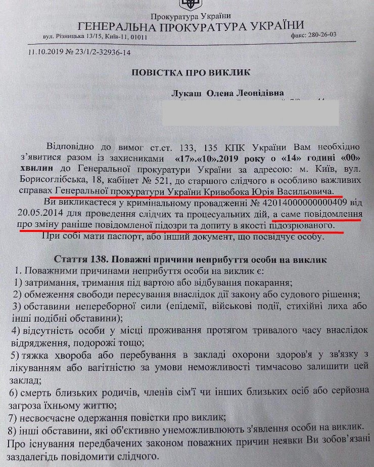 Она напомнила, что изначально подозрение ей составили 28 мая 2015 года. Но о нем уведомили не саму Лукаш или ее защиту. ГПУ направило его Верховному представителю ЕС Могерини с отметкой "конфиденциально".