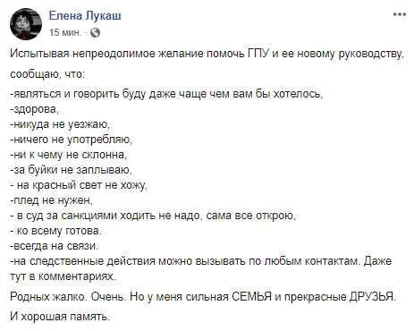 "Так появилась моя "конфиденциальная пидозра". Для того, чтоб ЕС не снимал с меня придуманные для унижения и расправы санкции. Потом была "блестящая операция" по моему задержанию, немного тюрьмы, залог и масса выигранных у ГПУ и ее функционеров судов... Шли годы. Имущества в ЕС никто не нашел. Санкции были сняты. Дело пылилось на полках, переезжая то в САП, то в НАБУ, то в опять в ГПУ….. Но закрывать его боялись все причастные", - написала Елена Лукаш.