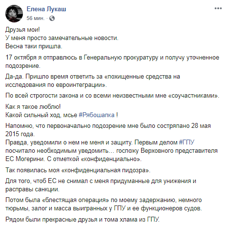 "Да-да. Пришло время ответить за "похищенные средства на исследования по евроинтеграции". По всей строгости закона и со всеми неизвестными мне "соучастниками". Как я такое люблю! Какой сильный ход, мсье Рябошапка!" - написала Лукаш.