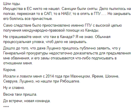 "Короче. Искали и ловили меня с 2014 года при Махницком, Яреме, Шокине, Севруке, Луценко, но нашли при Рябошапке. Ну и славно. Весна таки пришла. До встречи, новая команда", - добавила Лукаш.