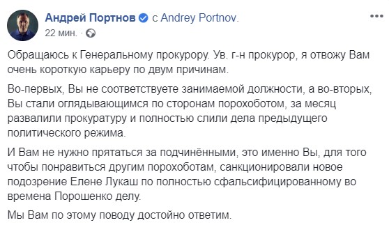 "Обращаюсь к Генеральному прокурору. Ув. г-н прокурор, я отвожу Вам очень короткую карьеру по двум причинам. Во-первых, Вы не соответствуете занимаемой должности, а во-вторых, Вы стали оглядывающимся по сторонам порохоботом, за месяц развалили прокуратуру и полностью слили дела предыдущего политического режима", - написал Портнов.