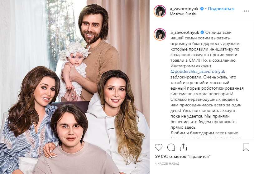 "От лица всей нашей семьи хотим выразить огромную благодарность друзьям, которые проявили инициативу по созданию аккаунта против лжи и травли в СМИ! Но, к сожалению, Instagram - аккаунт @podderzhka_azavorotnyuk заблокировали... Увы, восстановить аккаунт пока не удаётся. Мы приняли решение, что будем продолжать прямо здесь", - сказано в первом сообщении.