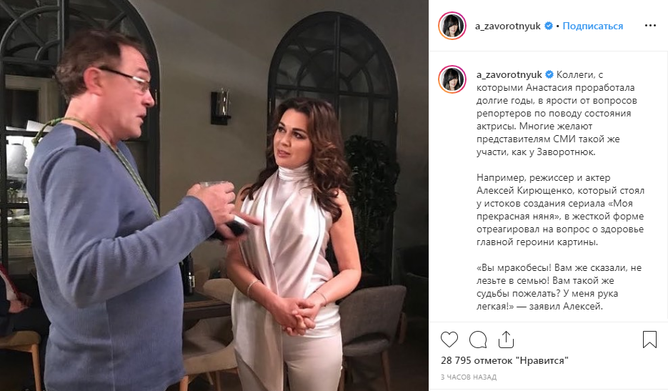 После этого в аккаунте опубликовали слова режиссера и актера Алексея Кирющенко, который стоял у истоков создания сериала "Моя прекрасная няня", который в жесткой форме отреагировал на вопрос о здоровье Анастасии Заворотнюк.