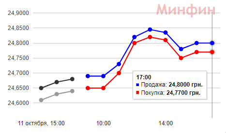 В банках курс доллара с утра был такой: покупка от 24 до 24,6 грн, продажа - от 24,7 до 25,05 грн.
