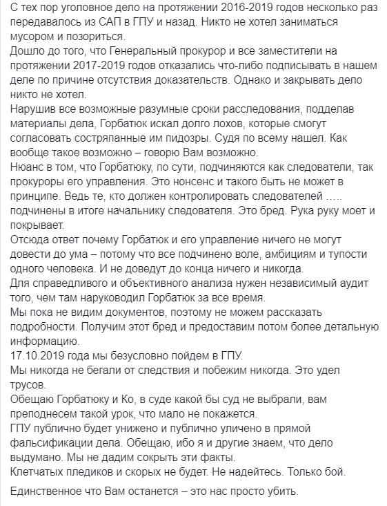 "Обещаю Горбатюку и Ко, в суде какой бы суд не выбрали, вам преподнесем такой урок, что мало не покажется. ГПУ публично будет унижено и публично уличено в прямой фальсификации дела. Обещаю, ибо я и другие знаем, что дело выдумано. Мы не дадим сокрыть эти факты. Клетчатых пледиков и скорых не будет. Не надейтесь. Только бой. Единственное что Вам останется – это нас просто убить", - подытожил он.