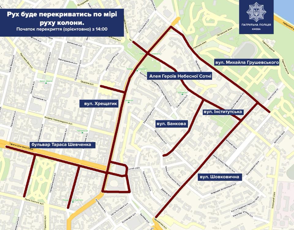 Одна колонна двинется по маршруту от парка имени Тараса Шевченко до улицы Банковой, другая - от парка имени Тараса Шевченко до улицы Грушевского (площадь Конституции). Пешеходными на некоторое время станут бульвар Тараса Шевченко, Крещатик, улица Михаила Грушевского, Аллея Небесной Сотни,  улицы Банковая. Институтская и Шелковичная.