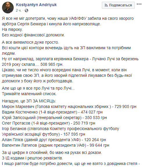 "Я все не мог сообразить, почему наша УАФ забила своего больного арбитра Сергея Беккера и бросила его на произвол судьбы. На полгода. Без финансовой помощи. А все оказалось очень просто. Все средства этой конторы очевидно идут на ЗП важным и нужным людям. Ну вот, например, зарплата Лучано Лучи за март 2019 года составила 508 985 гривен", - рассказал он.