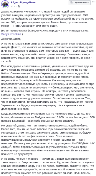 "Когда вы говорите про 5% продажных, то легко посчитать, вы же, тем более, айтишник: если на Майдан вышли 10 000, то там было где-то 500 продажных людей. Такая себе серьезная толпа сволочи. Но, дорогой Давид, нет. Там пяти сотен продажных людей не было. Более того, там их не было вообще. При таком количестве искренне желающих в этом нет даже циничного рацио. Это неправда. А, будучи произнесенной, это - фактическая ложь. Если какие-то партфункционеры получают зарплату и ходят на митинги - так и говорите. Партии у нас разрешены. И это другое дело. Но продажных людей, теток, пересчитывающих за углом купюры, титушек среди протестующих на митингах "Нет - капитуляции" нет. Их ни в каком проценте не существует".