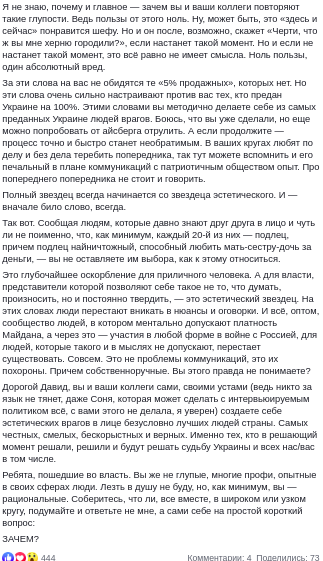 "Дорогой Давид, вы и ваши коллеги сами, своими устами ... создаете себе эстетических врагов в лице безусловно лучших людей страны. Самых честных, смелых, бескорыстных и верных. Именно тех, кто в решающий момент решали, решили и будут решать судьбу Украины и всех нас/вас в том числе".