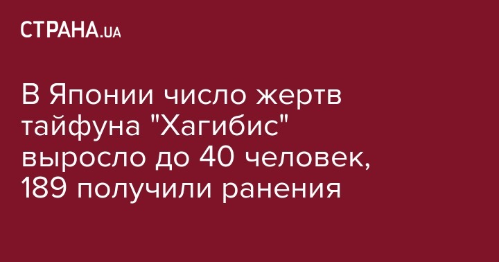 В результате мощнейшего тайфуна "Хагибис", который обрушился на Японию 12 октября, погибли уже 40 человек. Об этом со ссылкой на телеканал NHK пишет "Интерфакс-Украина"