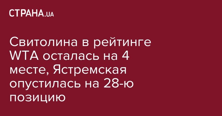 Еще одна украинская теннисистка Даяна Ястремская (1775) опустилась на 5 строчек и занимает 28-е место. Леся Цуренко (842), которая долгое время не выступает из-за травмы, занимает в списке 72-е место. Четвертый представитель Украины в первой сотне мирового рейтинга Екатерина Козлова (746) поднялась на 82-ю строчку (+1).