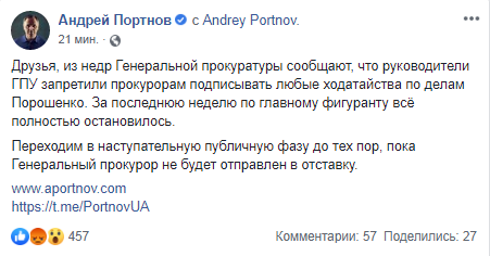 "Друзья, из недр Генеральной прокуратуры сообщают, что руководители ГПУ запретили прокурорам подписывать любые ходатайства по делам Порошенко. За последнюю неделю по главному фигуранту все полностью остановилось. Переходим в наступательную публичную фазу до тех пор, пока генеральный прокурор не будет отправлен в отставку", - написал Портнов.