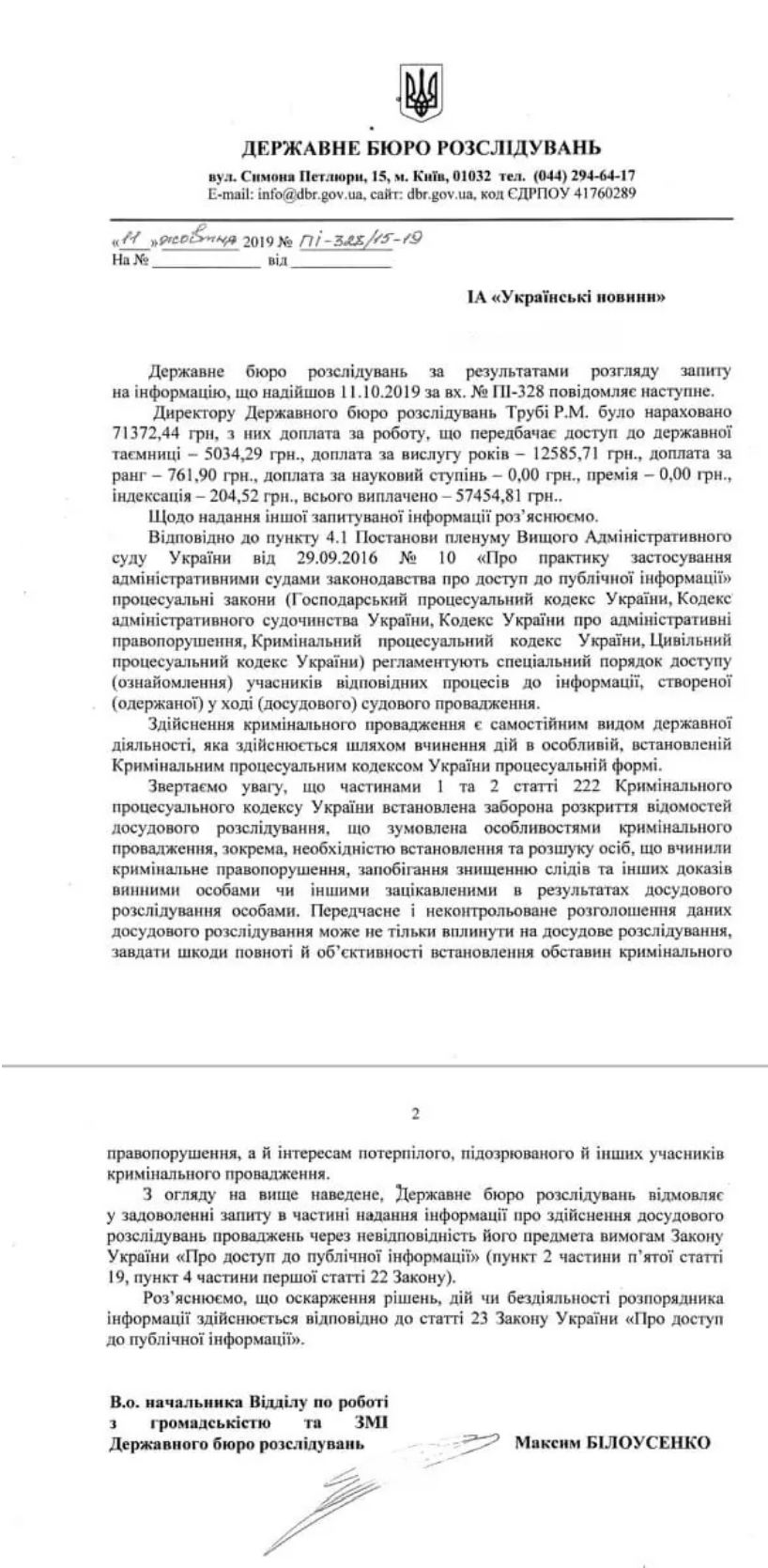 "Директору Государственного бюро расследований Трубе Р.М. было начислено 71372,44 грн. Из них доплата за работу, предусматривающую доступ к государственной тайне - 5034,29 грн, доплата за выслугу лет - 12585,71 грн, доплата за ранг - 761,90 грн, доплата за научную степень - 0 грн. Премия - 0 грн, индексация - 204,52 грн. Всего выплачено 57454,81 грн", - подробно расписано в документе.