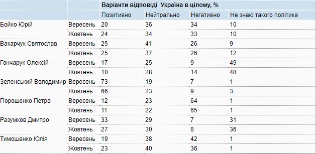 В октябре по сравнению с сентябрем снизилось число тех, кто положительно относится к деятельности президента Украины Владимира Зеленского, а рейтинги лидера партии "Оппозиционная платформа – За жизнь" Юрия Бойко и главы партии "Батькивщина" Юлии Тимошенко возросли.