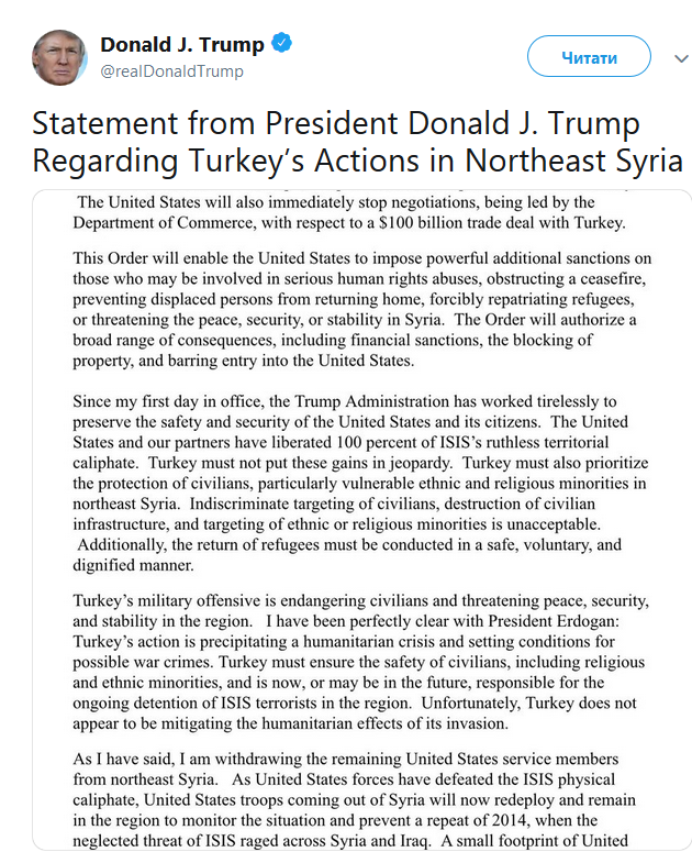 "Я полностью готов без промедления уничтожить экономику Турции, если турецкие лидеры продолжат идти по опасному и деструктивному пути", - так же заявил Дональд Трамп.