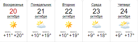 Сайт Weather.com сообщает, что в ближайшие дни погода будет преимущественно солнечной. Самым теплым днем будет 15 октября, когда температура поднимется до +23. В среду и четверг, 16 и 17 октября, будет до +22 днем и +7 ночью. Такая погода продержится до конца недели.