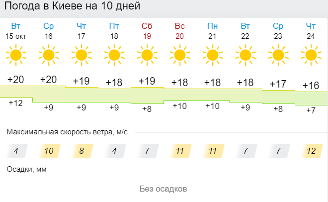 Погода в Киеве будет радовать теплом еще около 10 дней - до 24-25 октября. А затем может похолодать, небо затянут тучи, начнет моросить дождь, а ночью температура упадет до нуля.