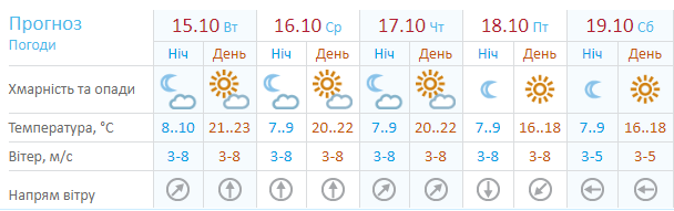 Сайт Sinoptik.ua дает прогноз на ближайшие 10 дней. По его данным теплая и сухая погода продлится минимум до 20 октября. Дневная температура на этой неделе будет на уровне +20...+21. Ночью +9...+13. Со следующей недели днем будет немного прохладней - +17...+19. Ночью +9...+10.