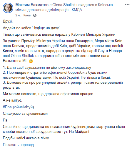 "Апдейт по кейсу "Чудище на крыше". Только что закончилась большое совещание в Кабинете министров Украины при участии премьер-министра Украины господина Гончарука, мэра города господина Кличко, представителей ГАСИ Киева, ГАСИ Украины, председателя нацполиции Киева, замов председателя КГГА, народного депутата от партии "Слуга народа" госпожи Елены Шуляк и советника киевского городского головы господина Бахматова", - написал он.