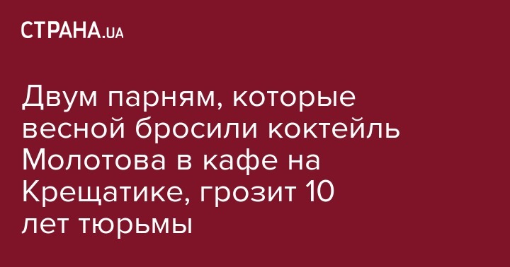 Как выяснилось во время следствия, двое 19-летних парней в ночь на 14 мая 2019 года приехали в центр Киева, подошли к кафе на Крещатике разбили стекло входной двери и бросили в зал подожженную бутылку с коктейлем Молотова. Из-за этого в заведении начался пожар.