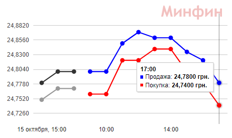 16 октября курс доллара в обменках незначительно подешевел: покупка - 24,80 грн, продажа - 24,85 грн. Межбанк закрылся удешевлением на 3 копейки: 24,74 грн - покупка и 24,78 грн - продажа. В банках вечером доллар покупают от 24,40 до 24,84 грн, продают - от 24,83 до 25,45 грн.