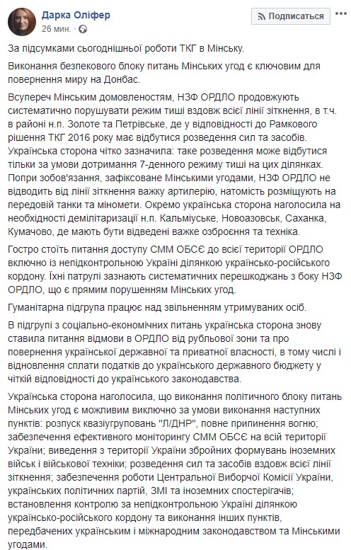 Но так как пост Олифер появился еще вчера и с тех пор никаких опровержений не было, написанное в нем можно воспринимать как официальную позицию представителя Украины на переговорах в Минске.
