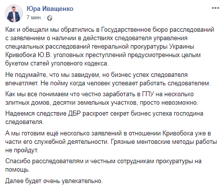 Кривобок, по данным Иващенко, который ссылается на антикоррупционных активистов, является самым богатым следователем Генеральной прокуратуры. Однако происхождение средств на приобретение десятков объектов недвижимого имущества - сомнительно и может быть связано с тяжкими преступлениями.