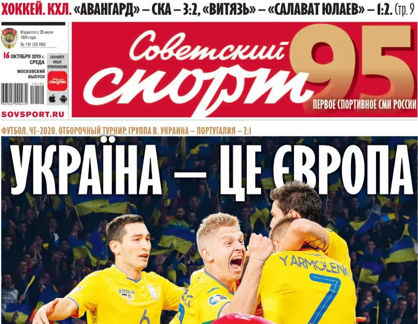 В среду, 16 октября, одно из ведущих спортивных изданий России - газета "Советский спорт" вышла с заголовком на украинском языке. Название статьи "Україна - це Європа" размещено на первой странице этого профильного ежедневника.