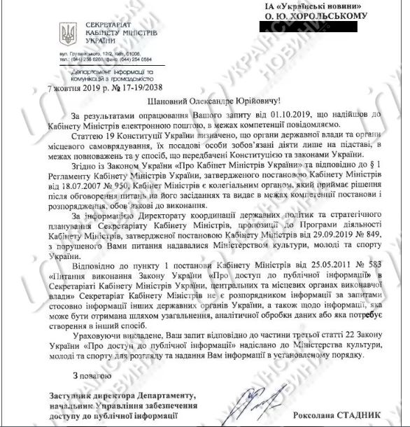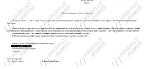 Ответ пришел из Министерства информационной политики (находится в стадии реорганизации и оперативно подчинено министру культуры, молодежи и спорта Владимиру Бородянскому) за подписью государственного секретаря министерства Артема Биденко. В нем уточняется, что какие-либо цифры при написании документа не использовались.