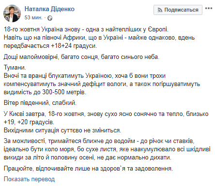 В пятницу, 18 октября, Украина останется одной из самых теплых стран Европы, температура воздуха в стране поднимается до +24 градусов. Об этом в Facebook написала синоптик Наталья Диденко.