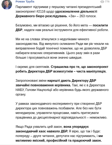 Директор Госбюро Роман Труба в своем Telegram заявил, что рад принятому законопроекту и что ГБР приветствует это решение, потому что его цель - усилить структуру, предоставить детективам реальные инструменты для эффективной работы. Также Труба развеял страхи тех, кто думает, что законопроект делает Директора ГБР всемогущим - чистая манипуляция.