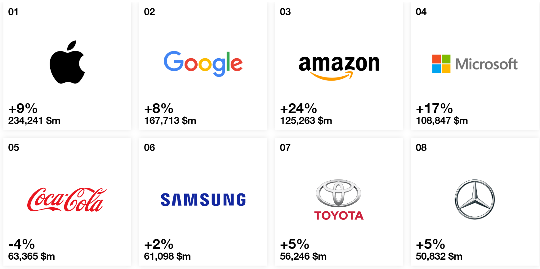 По подсчетам аналитиков, компания Apple в 2019 году подорожала до 234,241 миллиарда долларов США (на 9%), а Google - до 167,713 миллиарда долларов (на 8%). Третья строка в рейтинге досталась компании-сайту интернет-покупок Amazon (125,263 миллиарда долларов).