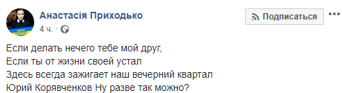 "Если делать нечего тебе мой друг, если ты от жизни своей устал, здесь всегда зажигает наш "Вечерний квартал". Юрий Корявченков, ну разве так можно?", - написала в Facebook Приходько, таким образом процитировав саундтрек телешоу.