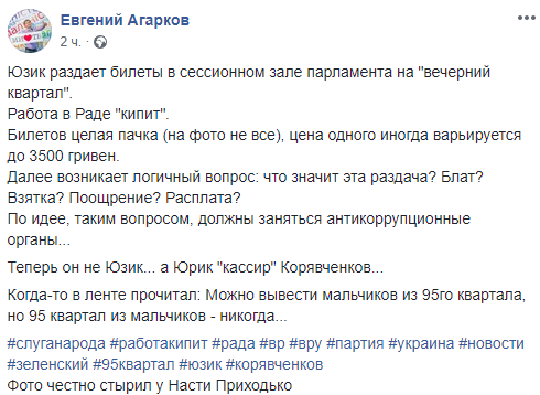 "Далее возникает логичный вопрос: "Что означает эта раздача? Блат? Взятка? Поощрение? Расплата? По идее, таким вопросом, должны заняться антикоррупционные органы ... Теперь он не "Юзик "... а Юрик" кассир "Корявченков ... когда в ленте прочитал: "Можно вывести мальчиков из "95 квартала" , но "95 квартал "из мальчиков - никогда", - говорится в сообщении журналиста.