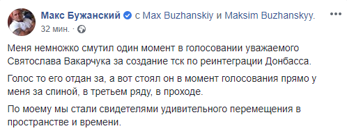 "Меня немножко смутил один момент в голосовании уважаемого Святослава Вакарчука за создание тск по реинтеграции Донбасса. Голос то его отдан за, а вот стоял он в момент голосования прямо у меня за спиной, в третьем ряду, в проходе. По моему мы стали свидетелями удивительного перемещения в пространстве и времени", - написал нардеп на своей странице в соцсети.