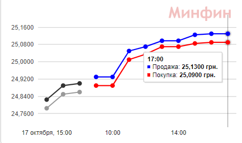 По состоянию на 12:00 18 октября доллар перевалил отметку в 25 грн на этой площадке: покупка 25,01 грн, продажа 25,05 грн.
