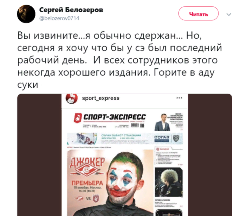 Вполне объяснимо, учитывая грим и характер Джокера, что в рунете взовалась бомба негодования, ведь, кто бы что ни говорил, а Спартак продолжает оставаться самым популярным российским клубом, несмотря на глубокий кризис.