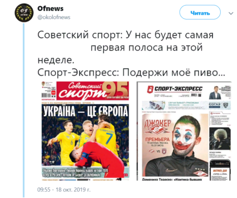 Правда не обошлось и без здорового чувства юмора. Ресурс Ofnews вспомнил первую полосу "Советского спорта".