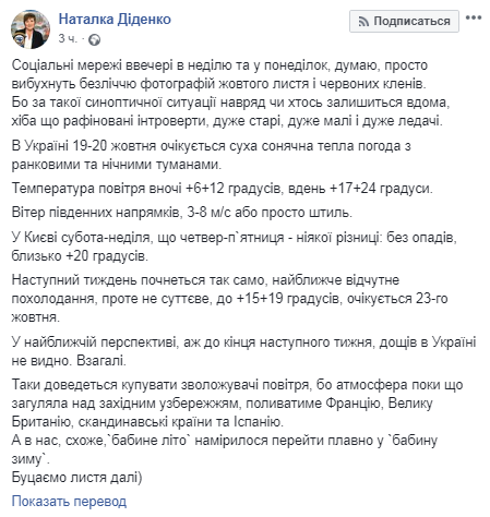 "Социальные сети вечером в воскресенье и в понедельник, думаю, просто взорвутся множеством фотографий желтых листьев и красных кленов. Поскольку при такой синоптической ситуации вряд ли кто-то останется дома, разве что рафинированные интроверты, очень старые, очень маленькие и очень ленивые", - написала Диденко.