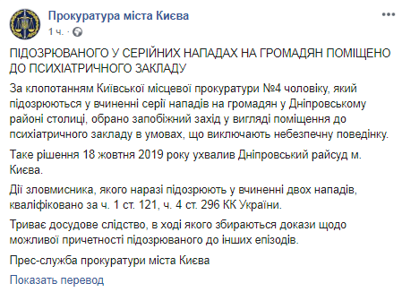 В сентябре этого года на территории Днепровского района Киева была совершена серия нападений на местных жителей. Правоохранители установили ​​причастность к совершению двух таких нападений 44-летнего местного жителя, который ранее находился на принудительном лечении в психиатрическом учреждении за совершение умышленного убийства в невменяемом состоянии.