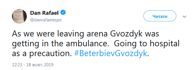 "Когда мы уходили с арены, Гвоздик садился в машину скорой помощи. Отправился в больницу в качестве меры предосторожности", - написал Дэн Рафаэль.