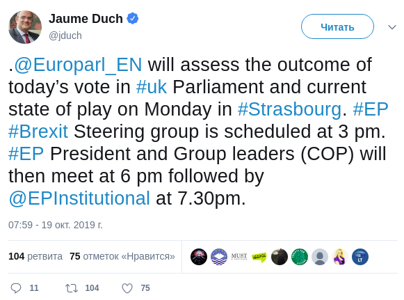 Европейский парламент в Страсбурге в понедельник, 21 октября, оценит результаты голосования в парламенте Великобритании по Brexit. Об этом в Twitter сообщил официальный представитель Европарламента Жауме Дук.