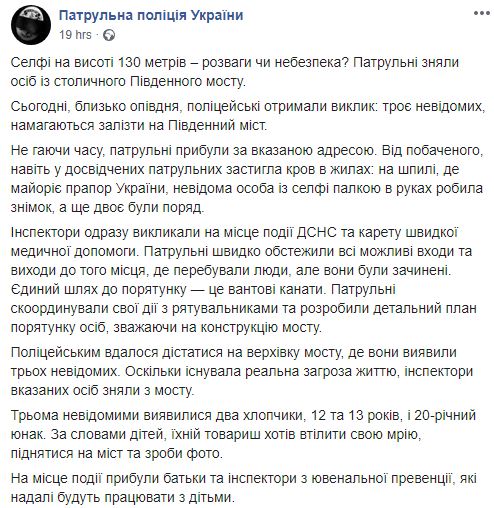 "Около полудня в субботу, 19 октября, полицейским поступила информация о трех неизвестных, которые пытались залезть на Южный мост. Патрульные прибыли по указанному адресу. Полицейским удалось забраться на верхушку моста, где они обнаружили трех неизвестных. Поскольку существовала реальная угроза жизни, инспекторам пришлось задерживать указанных лиц", - говорится в сообщении.